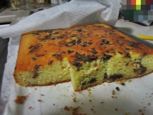 Unite il composto al cacao nella teglia e cospargete il tutto con le gocce di cioccolato.