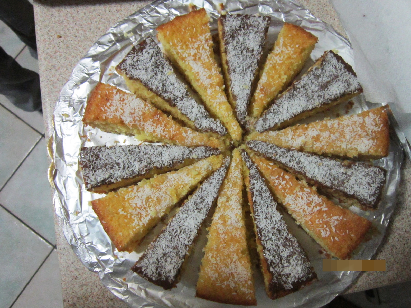 Per decorarla io ho ricoperto una metà di cioccolata e poi ho cosparso il tutto con la farina di cocco, e ho servito la torta alternano le fette con la cioccolata a quelle con solo la farina di cocco.