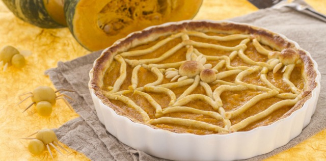 Con la pasta frolla che avanza preparate delle strisciolineda utilizzare per fare il disegno di una ragnatela, poi modellate due ragni : formate quattro palline, due più grandi per il corpo e due più piccole per la testa, e adagiatele sulla ragnatela. Fate cuocere la torta in forno caldo, preriscaldato, a 200° per i primi 20 minuti e poi a 180° per altri 30 min; se la torta dovesse colorire troppo, coprite lo stampo con della carta di alluminio e terminate la cottura. Trascorso il tempo necessario estraete dal forno la torta, fatela raffreddare completamente e poi decorate con delle lamelle di mandorle i ragnetti, in modo da formare le zampette