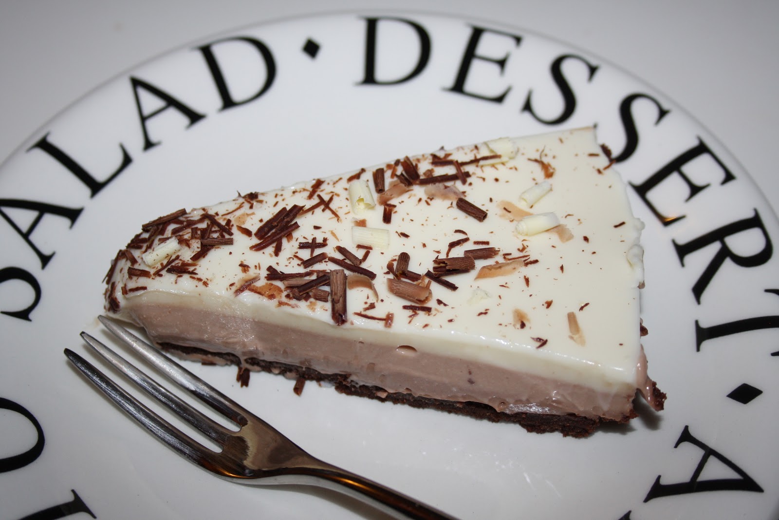 Estraete la base ormai compatta e versate per prima la crema al cioccolato fondente, poi quella di cioccolato al latte e infine coprite la superficie di cioccolato bianco.
