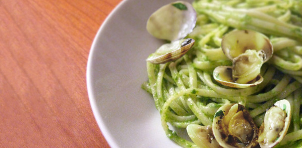 Cuocete la pasta in abbondante acqua bollente salata, scolatela al dente, aggiungete le vongole e il pesto e servite con una spolverata di prezzemolo.