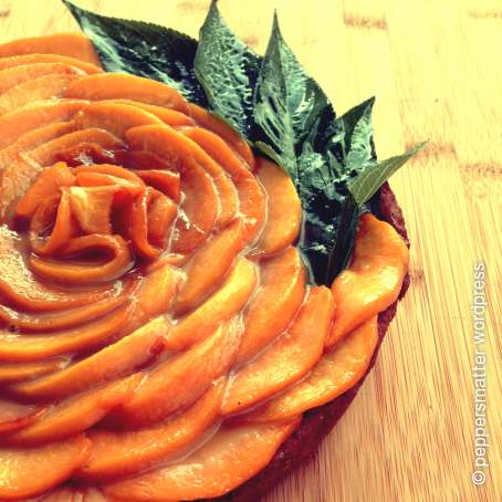 Disponete le pesche e le Foglie di Salvia sulla torta, utilizzate il caramello che si è formato per lucidare le pesche, lasciate riposare in frigorifero almeno un paio di ore prima di servire.