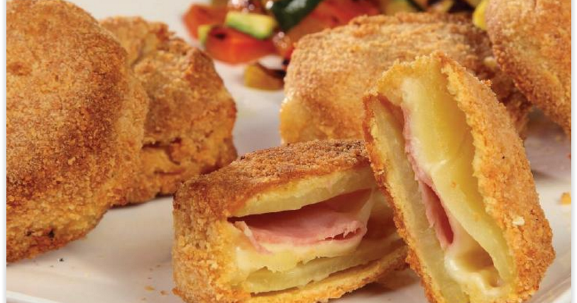 Preparate i sandquich di patate mettendo una fettina di prosciutto cotto ed una di formaggio su una fetta di patata e chiudendo il tutto con un'altra fetta di patata.
