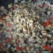 -Dopo di che, lavare le fette e asciugarli bene. facciamo il passaggio attraverso la farina e la pastella di uova e friggetele in olio bollente. rimoviamo basandoci sulla doratura e mettiamo su carta assorbente. Ripetiamo l'azione fino a quando tutte le sezioni sono fritte. Riservati.-Per il ripieno, mettere un paio di cucchiai di olio d'oliva in una padella e quando è caldo, aggiamo la cipolla tritata, le melanzane (che avevamo inzuppato e tritata finamente) e el peperone a piccole fette. lasciate cuocere per circa 15 minuti. Dopo 10 minuti, aggiungere i funghi tritati, mescolare bene e continuare a cuocere, mescolando ogni tanto.