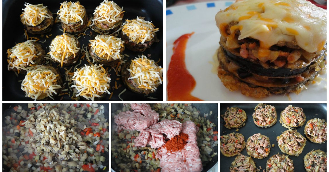 -In uno stampo per il forno assambliamo le millefoglie e mettiamo una fetta di melanzana fritta, sopra un cucchiaio di carne con verdure,un'altra fetta di melanzana, carne ancora e un'ultima fetta di melanzana.