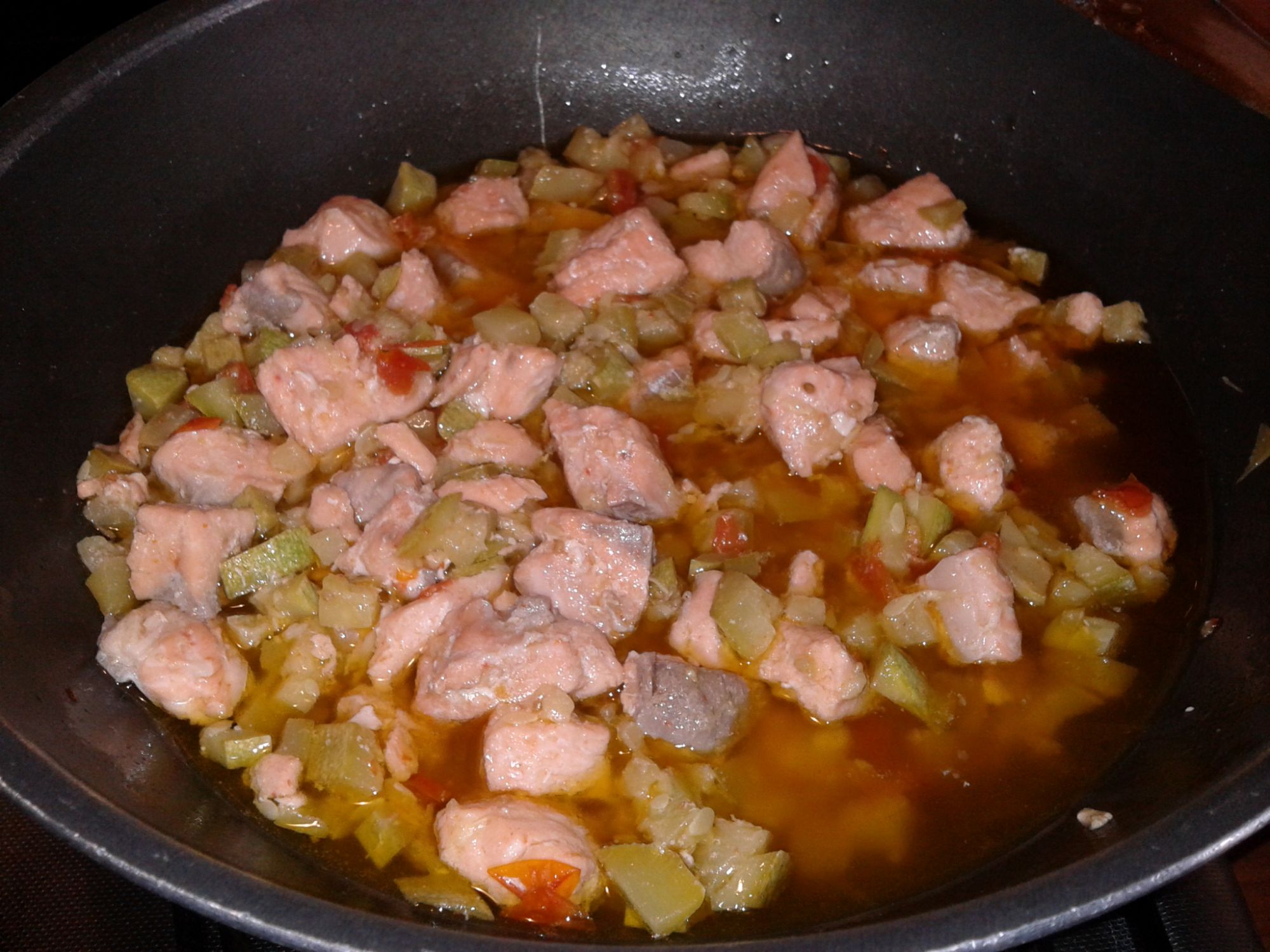 Tagliate il salmone a cubetti, quindi aggiungerlo alla padella, aggiustando di sale e peperoncino.