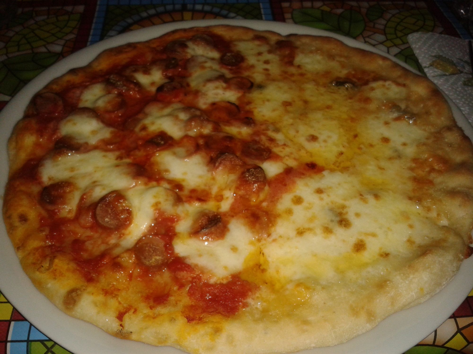Nella pizza in foto c'è una metà con base di pomodoro, mozzarella e wurstel; per l'altra metà sono stati usati: gorgonzola, asiago, mozzarella, parmigiano.