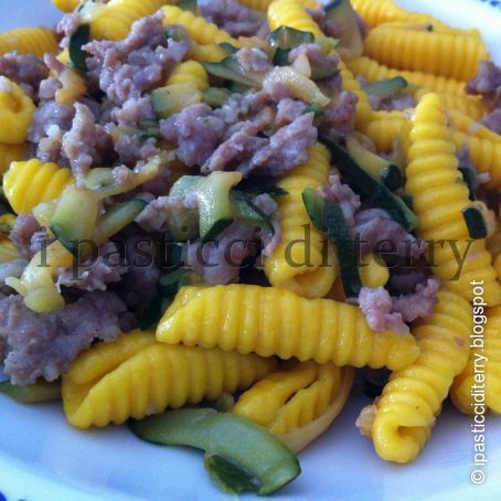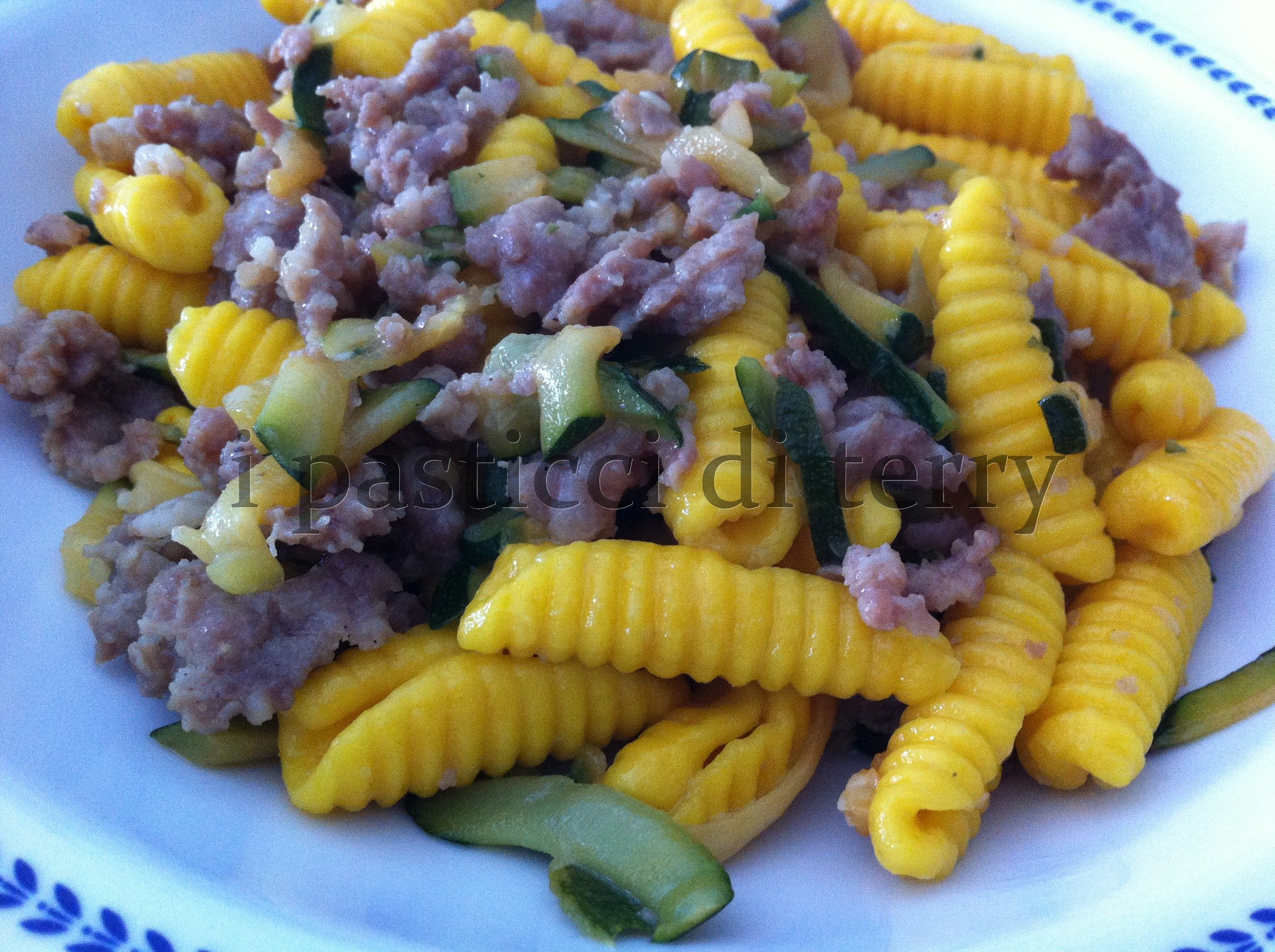 Una pasta fatta in casa, con aggiunta di zafferano nell'impasto. Condita con salsiccia e zucchine, direi un piatto unico. con una bella insalata e un frutto, un pasto completo.