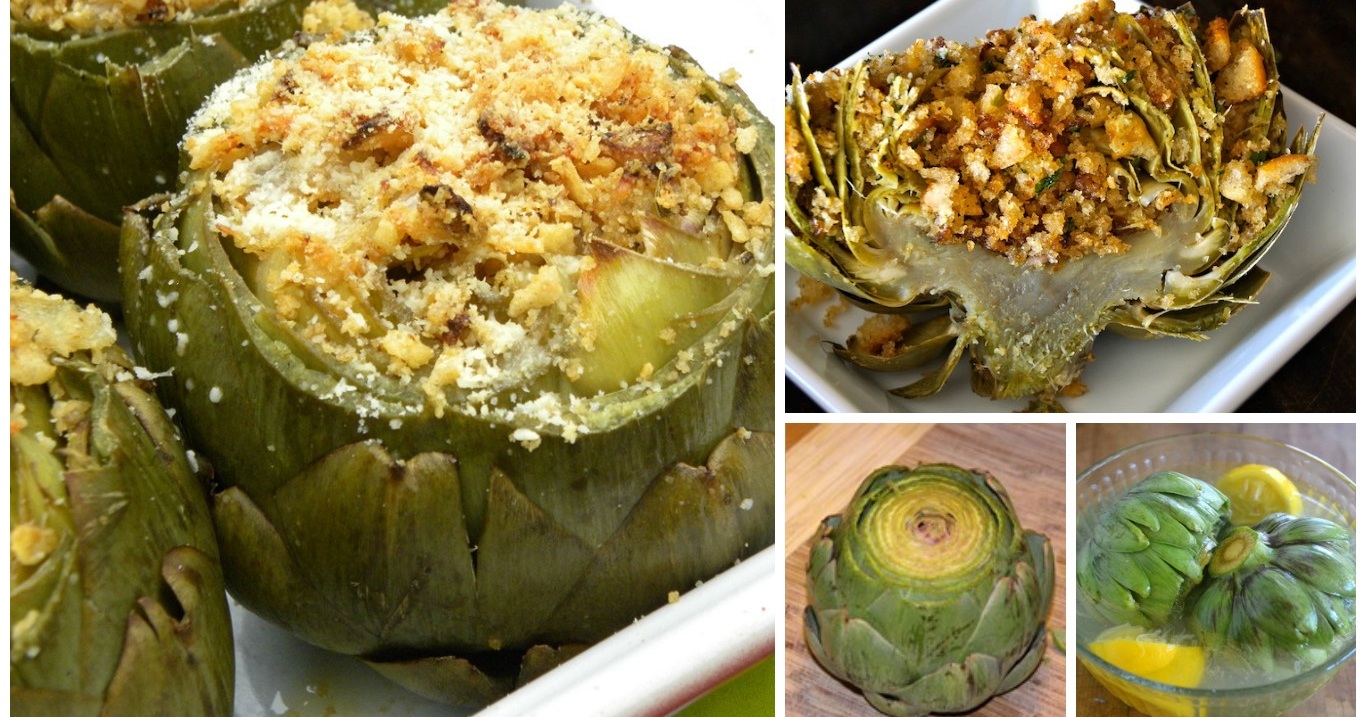 Tagliate il gambo a due dita dalla base del carciofo, private i carciofi delle foglie dure più esterne, tagliate 1/3 della parte superiore, pulite anche i gambi (strofinatevi le mani con il succo di limone per non farle annerire) e metteteli in una scodella con acqua e succo di limone. Tritate aglio, prezzemolo e mentuccia, unite un pò di pangrattato e olio per dare consistenza all'impasto, salate e pepate. Togliete con un cucchiaino o coltello un pò dell'interno del carciofo e introducete il ripieno. Allineate i carciofi capovolti in una casseruola ed unite anche i gambi tagliati a pezzetti. Corpargete di mezzo bicchiere di olio e acqua necessaria a ricoprirli per la metà. Unite il dado granulare (in alternativa 1 dado) e cuocete con coperchio per circa 45 minuti/1 ora o finchè+ saranno teneri. Serviteli cosparsi della salsetta di fondo cottura.