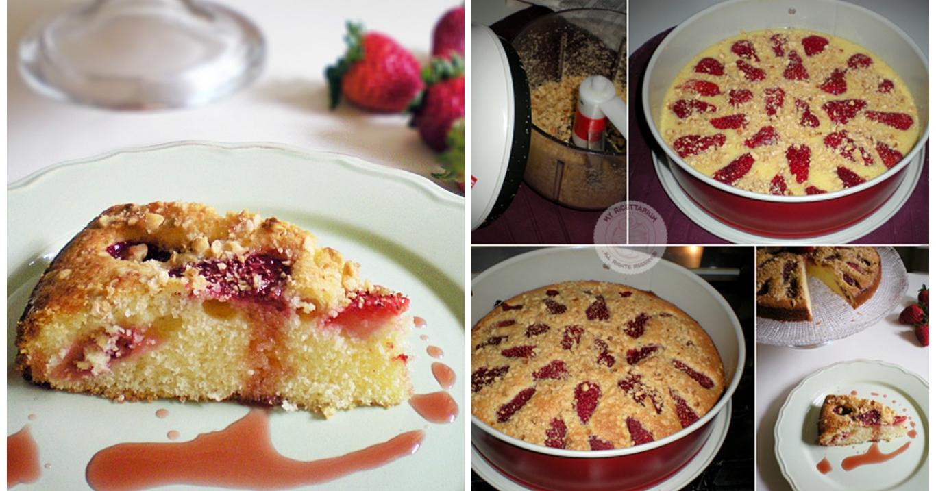 Tritate grossolanamente le nocciole. In una ciotola sbattele con una frusta le uova con lo zucchero finchè saranno chiare e spumose. Unite l'olio, il succo di limone ed infine la fecola, la farina ed il lievito setacciati e mescolate bene. Trasferite il composto in uno stampo precedentemente unto. Lavate ed asciugate le fragole, tagliatele a spicchi ed adagiateli sulla superficie del composto, senza affondare. Corspargete anche con le nocciole tritate ed infornate in forno già caldo a 180° per circa 40 minuti (fate semrpe la prova stecchino). Attendete che sia fredda prima di toglierla dallo stampo. Quando la servirete, a piacere potrete guarnire la fetta con sciroppo di fragole.