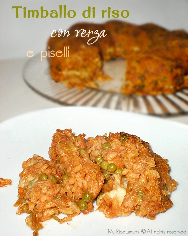 Pulite, lavate e tagliate a pezzetti la verza e fatela saltare in una casseruola con l'olio e lo spicchio di aglio (se non utilizzate pisellini già cotti, unite anche questi). Bagnate con poco vino, attendete che evapori e versate la passata. Unite sale e peperoncino e cuocete unendo acqua poco a poco finchè il sugo di verza non sarà cotto. Cuocete il riso fino a metà cottura, scolatelo ed amalgamatelo al sugo di verza, unite anche i pisellini, il parmigiano ed aggiustate di sale se occorre. Ungete uno stampo da ciambella, spolveratelo di pangrattato e versate metà riso cercando di schiacciare e livellare bene, adagiate l'emmental tagliato a fette e coprite con il riso restante, schiacciate livellando bene. Spolverizzate di pangrattato ed infornate in forno già caldo a 180° per circa 40 minuti. Fate intiepidire una decina di minuti prima di togliere dallo stampo.