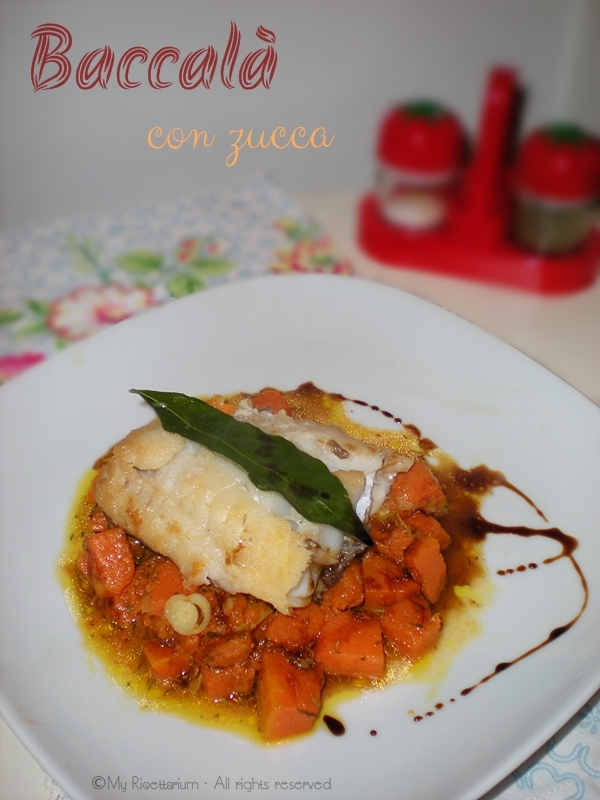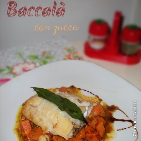 In un tegame cuocete la zucca tagliata a dadini con il porro a pezzetti, l'olio, il sale, timo e rosmarino finchè non sarà cotta, ma non sfatta. In una larga padella cuocete nell'olio e nel porro tagliato a pezzetti i filetti di baccalà. Sfumate con il marsala. Unite l'alloro, un pò d'acqua ed il dado granulare. Aggiungete alla zucca un pò del fondo di cottura del baccalà. Cuocete il baccalà finchè sarà cotto. Servite mettendo in un piatto un pò di zucca ed adagiandovi sopra il baccalà con una foglia di alloro e guarnendo intorno con la glassa di aceto balsamico