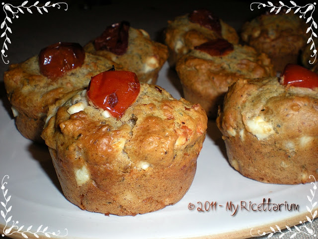 Sbattete con una frusta l'uovo con l’olio, il latte ed il patè. A questo punto aggiungete la farina setacciata con il lievito, unite sale, pepe, menta ed origano e da ultimo, mescolando con un cucchiaio in legno, aggiungete anche la feta tagliata a cubetti piccoli. Distribuite il composto negli stampini da muffin riempendoli per 2/3, adagiate su ognuno un pomodorino ed infornate a 180 gradi per circa 25 minuti. Fate intiepidire leggermente e servite.