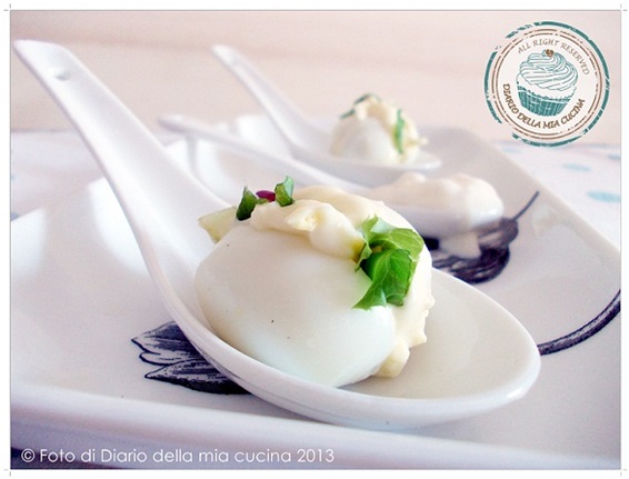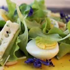 Fate bollire le uova in un pentolino con acqua e qualche cucchiaio di aceto bianco per 5 minuti (da quando bolle). Lasciatele intiepidire, sgusciatele delicatamente facendo attenzione a non romperle e lasciate in un piatto a raffreddare completamente. Intanto lavate e asciugate bene la misticanza. Dividete a metà le uova, mettete in una ciotola i tuorli e mescolate con il formaggio, un pizzico di sale e pepe schiacciando bene con una forchetta ottenendo una crema omogenea. Riempite le uova con la crema di formaggio, mettete sopra una metà qualche foglia di insalata e coprite con un’altra parte di uovo farcito. Proseguite fino a quando avrete finito il ripieno o le uova e servite.