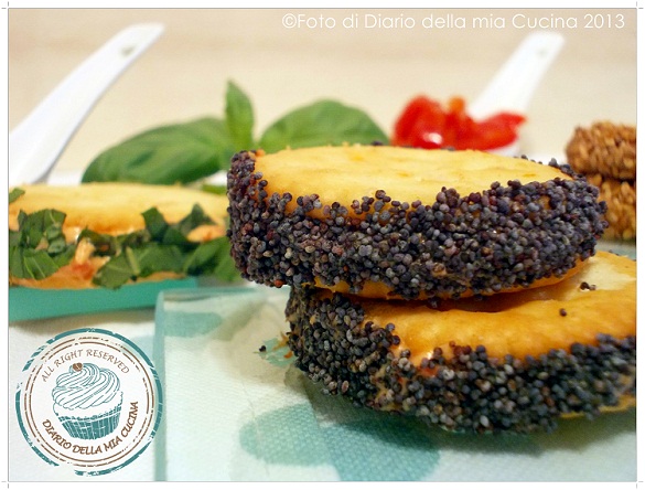 Fate rosolare dolcemente lo scalogno in un po’ di olio. Lavate e asciugate il peperone, tagliatelo a dadini e fatelo cuocere nella padella con lo scalogno, salate, aggiungete un paio di foglie di basilico e un cucchiaino di prezzemolo tritato. Fate cuocere per 10 minuti con il coperchio e spegnete. Prendete la ricotta, condite con un pizzico di sale e pepe, aggiungete i peperoni frullati e mescolate. Spalmate la crema sopra i ritz e copriteli con un altro sopra. Fateli roteare nei semi di sesamo e/o di papavero e servite.