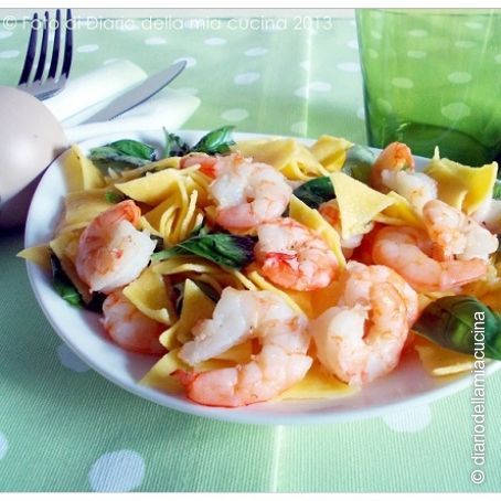 Eliminate il carapace e la testa dai gamberi, sbollentateli in abbondante acqua leggermente salata e scolateli. Lavate e asciugate il basilico e il limone, fate cuocere i maltagliati in acqua salata e scolateli al dente. Condite la pasta con olio e lasciate intiepidire. In un’insalatiera versate i gamberi, il basilico spezzettato con le mani, la buccia del limone e la pasta, condite con olio, pepe e sale se serve e mescolate. Lasciate riposare 10 minuti e servite.