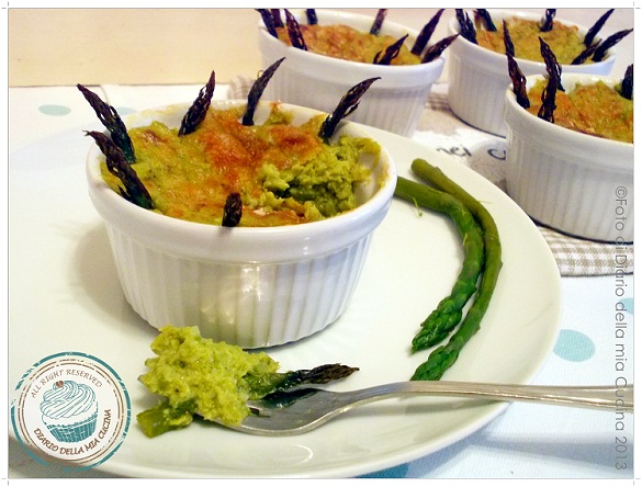 Lessate le patate, scolatele e tenetele da parte. Eliminate dagli asparagi la parte legnosa, legateli in un unico mazzo e fateli lessare tenendo fuori dall’acqua le punte che cuoceranno con il vapore dell’acqua. Tagliate alla stessa altezza 7/8 punte degli asparagi per ogni cocotte e tenetele da parte. Mettete nel mixer gli asparagi rimasti e la parte eliminata dalle punte, le patate, la panna, il sale, il pepe, il burro, l’uovo, il parmigiano e frullate fino a ottenere un composto cremoso. Imburrate le cocotte e versate dentro il composto, sistemate intorno ai bordi le punte di asparagi, cospargete di parmigiano e infornate a 180° per 20 minuti o a doratura desiderata. Lasciate riposare una decina di minuti per far passare il bollore e servite.