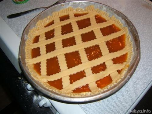 Stendere la carta da forno sulla teglia e la pasta sopra, lasciando un po' di pasta da parte per fare delle strisce. In forno a 180° per 30 minuti.