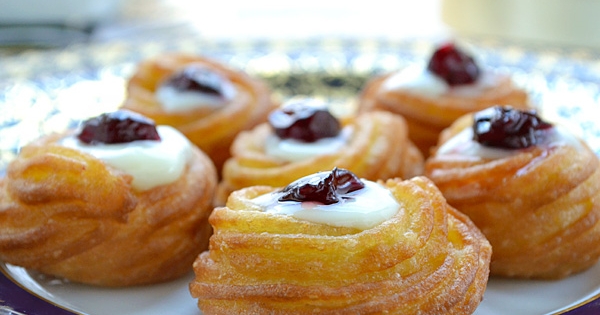 Una volta asciutte, guarnire con crema pasticcera, amarena, e zucchero a velo.