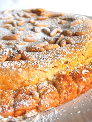 Distribuite i pinoli su tutta la superficie della torta, premendo leggermente con le mani per farli aderire alla pasta frolla, quindi infornate la torta della nonna in forno già caldo a 180° per circa 45-50 minuti.