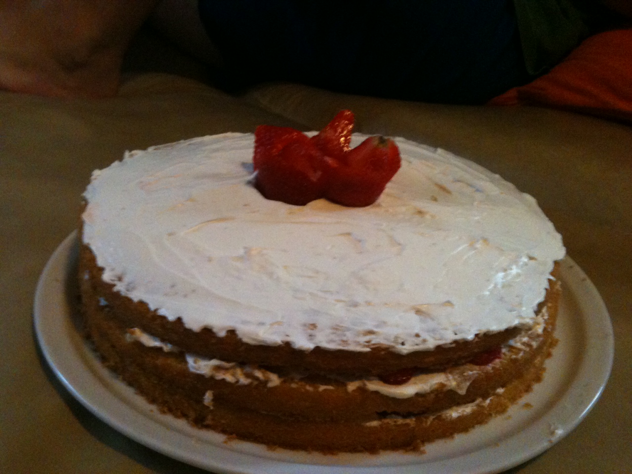 Bagnate abbondantemente con l’aiuto di un pennello ma anche di un cucchiaio il primo disco, aggiungete la panna e poi le fragole tagliate a pezzetti.