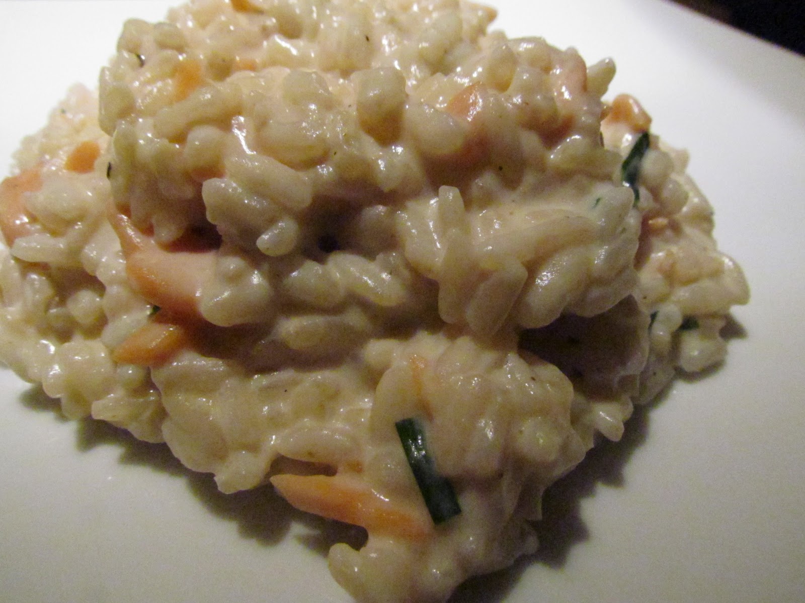 In una padella grande far sciogliere il burro con il salmone tagliato a pezzetti, versare il riso e mescolare.