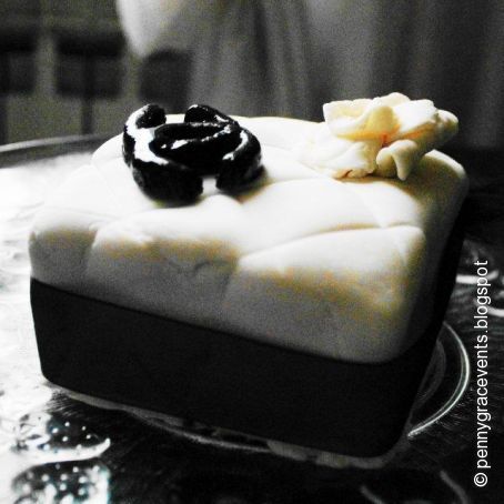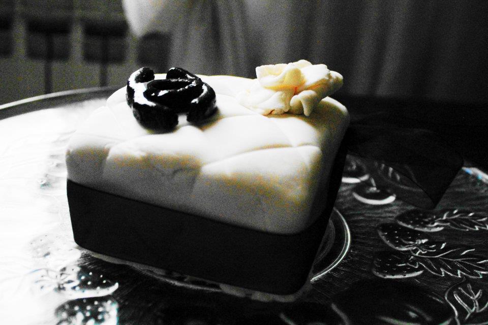 - Per completare la nostra torta passiamo il nastro di organza nero intorno ai bordi della torta, chiudendolo con un fiocco.