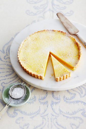Poni 300 g di burro reso morbido a temperatura ambiente in una terrina e lavoratelo molto bene, finché otterrai una crema. Unisci i tuorli uno alla volta e la scorza grattugiata del limone, mescola bene dopo ogni aggiunta. Tieni da parte 3 albumi. Aggiungi lo zucchero e sempre mescolando la fecola e 130 g di farina. Amalgamati bene tutti gli ingredienti, monta a neve gli albumi e uniscili al composto delicatamente per non smontarli. Imburra una tortiera del diametro di 28 cm a bordi alti e versa il tutto. Poni nel forno già caldo a 170°C per 40 minuti. Togli dal forno, disponi su un piatto da portata e prima di servire a piacere cospargi con lo zucchero a velo.