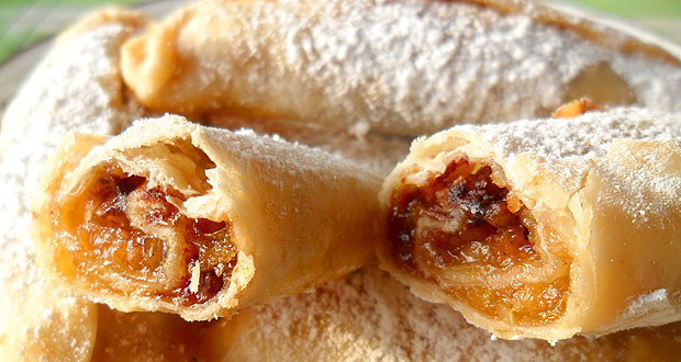 Per una preparazione ancora più rapida, potete preparare uno strudel unico, farcendo direttamente tutto il rettangolo di pasta sfoglia che poi arrotolerete ed una volta cotto taglierete a fettine.