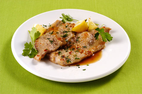 Infarinate e salate 8 fettine di fesa di vitello; rosolatele in un filo di olio, bagnatele con il succo di un limone, cuocetele per 10 minuti e insaporitele con un trito di prezzemolo.