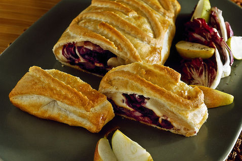 Tagliare il radicchio a striscie e la scamorza a tocchetti, sbucciare la pera e ridurla a dadini. Passare in padella il radicchio con l'olio, unire i dadini di pera e rosolarli a fuoco medio per 2-3 minuti.