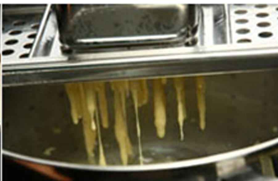 Tritate l'erba cipollina a coltello (4) e tenete da parte; quando l’impasto è pronto, prendete l'apposito attrezzo per spatzle, oppure la pressa simile ad uno schiacciapatate posizionatelo sopra una pentola di acqua in ebollizione (5), riempitela di impasto e fate fuoriuscire gli gnocchetti (6).