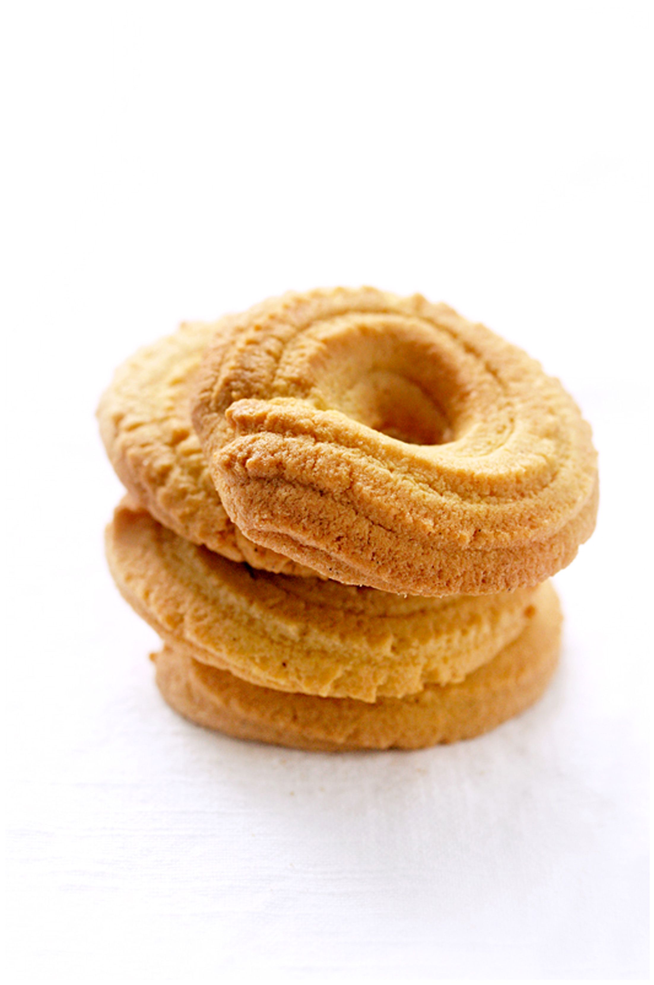 4. Setacciare insieme le due farine e il lievito, aggiungere all'impasto e lavorare finchè risulti omogeneo. Trasferire in una sac à poche o in una siringa con la punta a stella di circa 1,5 cm e formare delle ciambelline di circa 5 cm di diametro su una teglia rivestita di carta forno (oppure far rassodare l'impasto in frigo per almeno 2 ore, meglio tutta la notte, stenderlo con un mattarello e ritagliare i biscotti con un coppapasta).