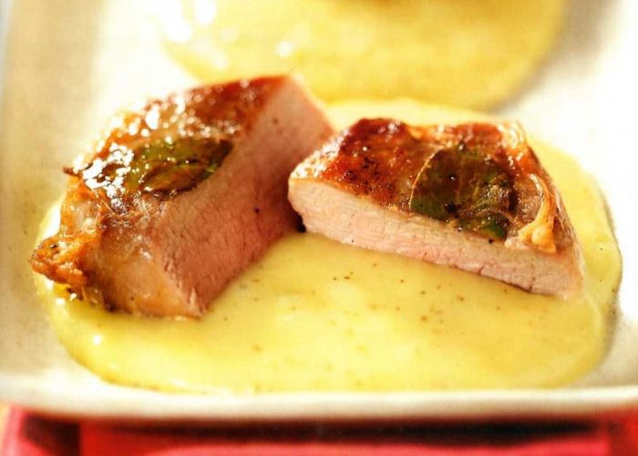 Cuocere il maiale in olio e aglio, sfumare con vino rosso. Servire i bocconcini sulla purea di patate al brie