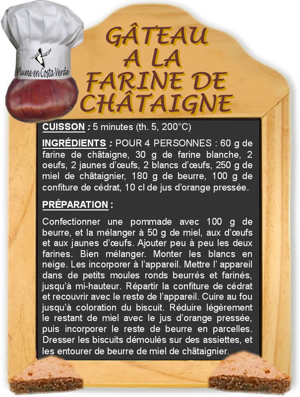 - 200 g. farina di castagne, 50 g. di farina bianca, 1 pizzico di sale, 20 cl. latte, 3 uova, 2 cucchiai di olio, 50 g. zucchero.