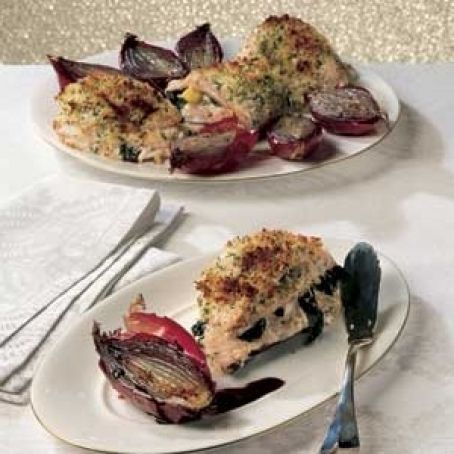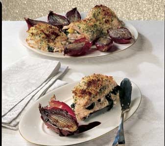 Per prima cosa dovrete preparare le cipolle al forno, oliando leggermente una teglia ricoperta di carta da forno, su cui metterete anche sale e pepe a vostro piacere e dopo aver tagliato le cipolle a metà,infornatele con la parte tagliata verso il basso, per circa mezz'oretta a 220 °C.