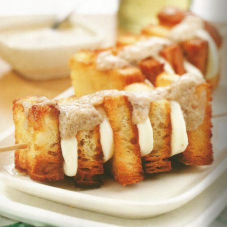 Con uno stecchino per spiedini infilzare pane e formaggio alternandoli. Distribuire gli spiedini su una teglia da forno e cuocere a 200 °C per 15 minuti, spennellando ogni tanto con burro fuso.