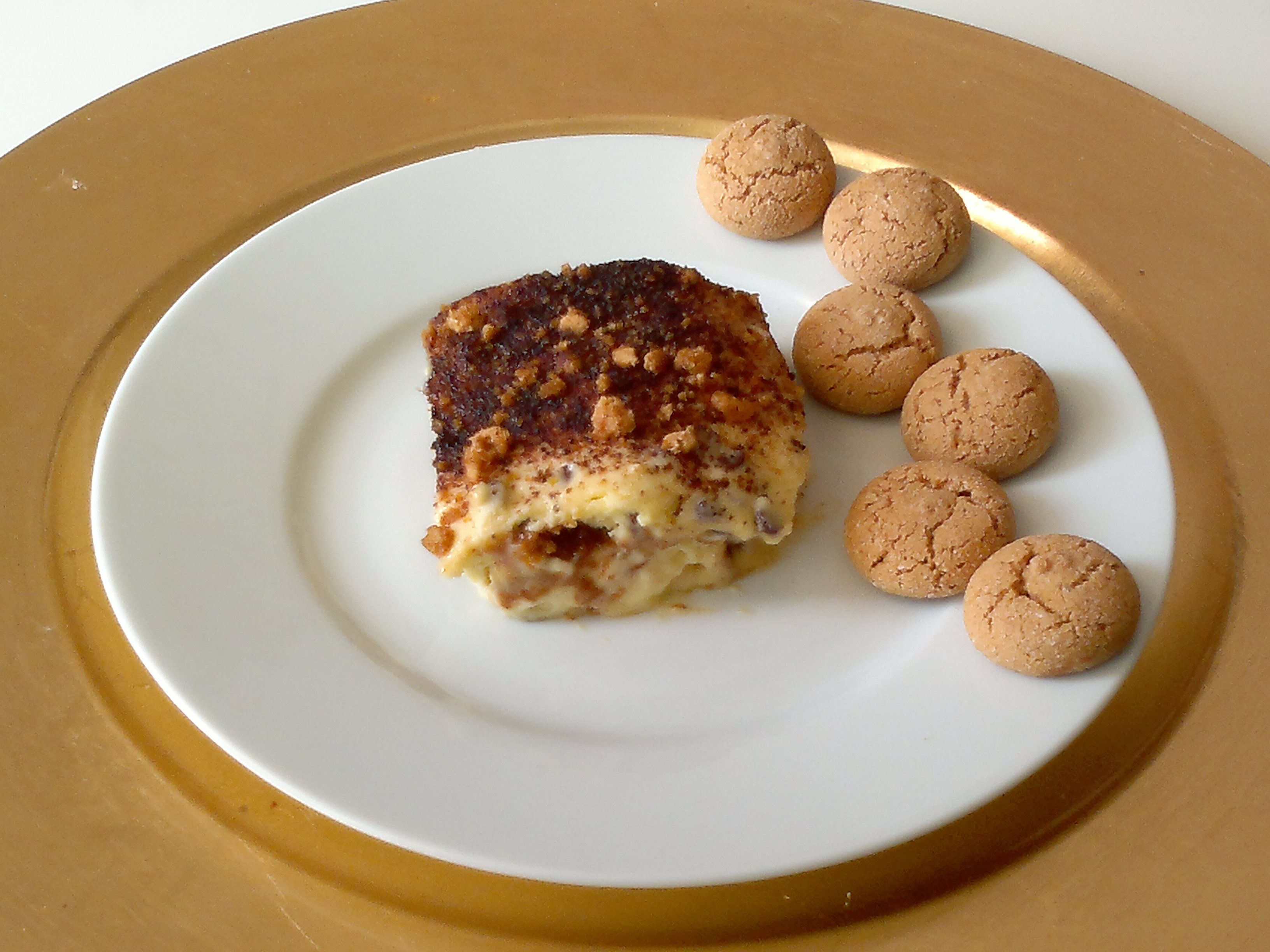Prendere una ciotola da portata e alternare il composto di mascarpone con un pò di amaretti imbevuti , poi mascarpone, amaretti, ecc....fino a riempire la ciotola. Prendere il restante cioccolato tritato finemente e cospargerlo il più uniformemente possibile in superficie. Mettere in frigorifero per almeno 3 ore e servire.
