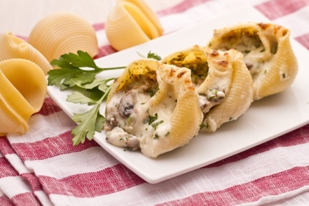 Conchiglioni ripieni di funghi, prosciutto e besciamella