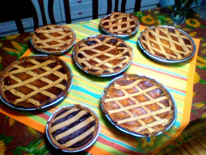 - PASTA FROLLA (per ogni kg di grano): 1,5 kg di farina – 600 gr di zucchero – 600 gr. di burro – 8 uova intere – 2 tuorli – 2 bustine di vanillina – 2 bustine di lievito Pane Angeli – buccia grattugiata di un limone.