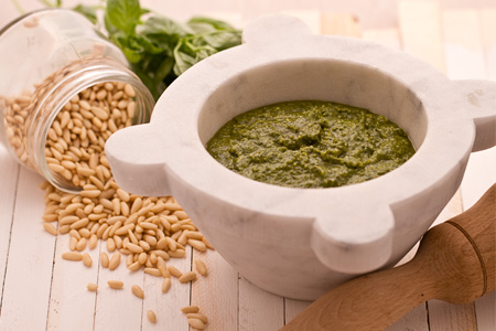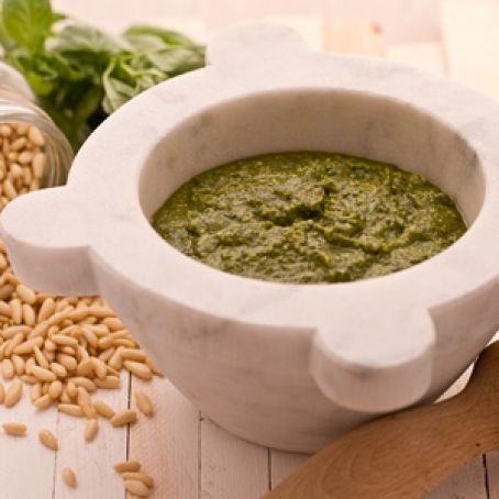Per preparare il pesto alla genovese bisogna innanzitutto precisare che le foglie di basilico non vengano lavate, ma pulite con un panno morbido, e che si tratti di basilico ligure o Genovese, a foglie strette. Iniziate la preparazione del pesto ponendo l'aglio sbucciato nel mortaio assieme a qualche grano di sale grosso. Cominciate a pestare e quando l'aglio si sarà ridotto in crema, aggiungete le foglie di basilico insieme ad un pizzico di sale grosso , che servirà a frantumare meglio le fibre e a mantenere un bel colore verde acceso schiacciate, quindi, il basilico contro le pareti del mortaio ruotando il pestello da sinistra verso destra e contemporaneamente ruotate il mortaio in senso contrario (da destra verso sinistra), prendendolo per le "orecchie" ,ovvero le 4 sporgenze tondeggianti che caratterizzano il mortaio stesso, continuate così fino a quando dalle foglie di basilico non uscirà un liquido verde brillante, a questo punto aggiungete i pinoli e ricominciate a pestare per ridurre in crema.