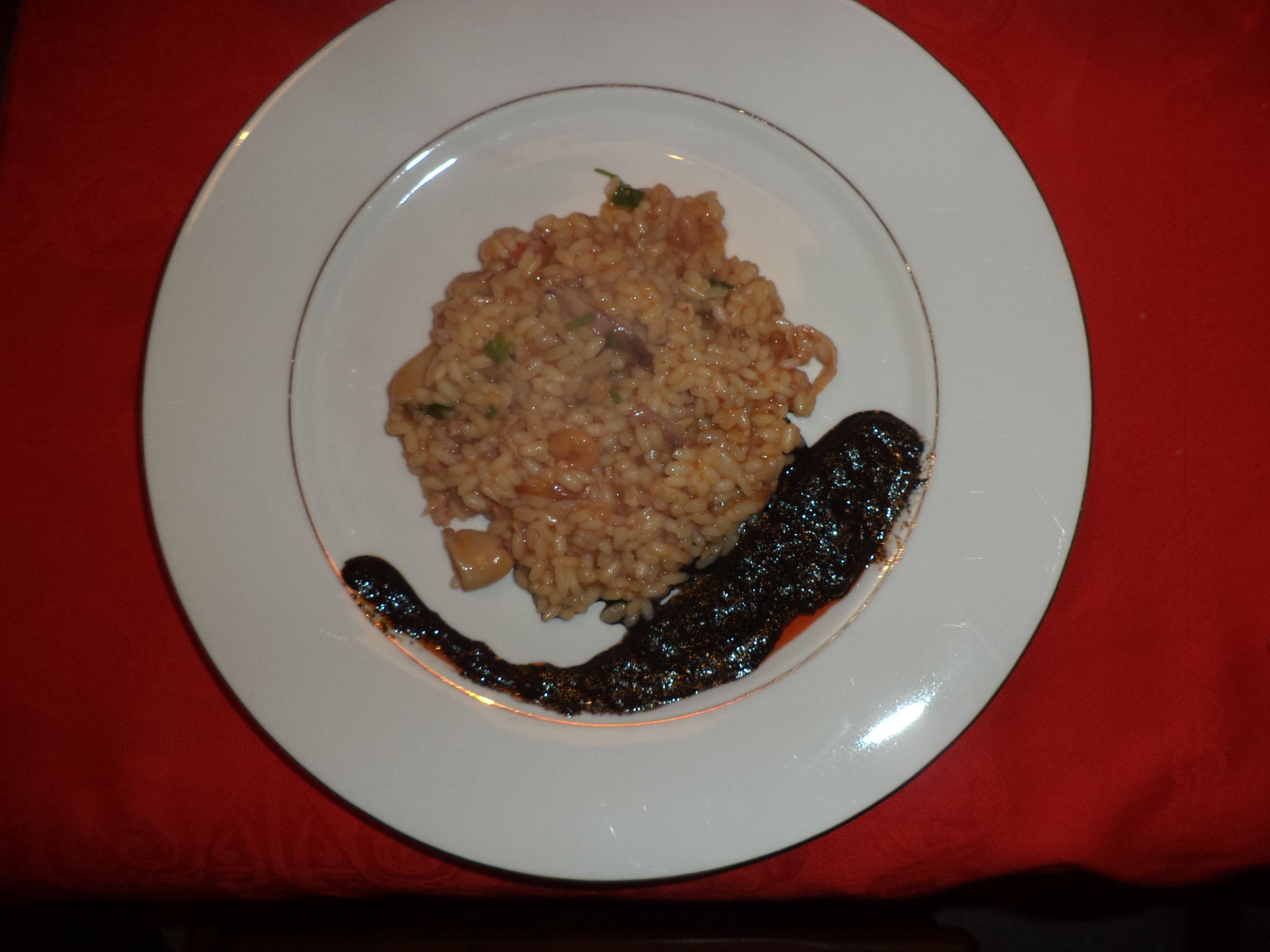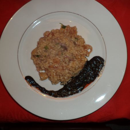Terminata la cottura mettere del risotto e del nero di seppia servire a tavola e fare un decoro con il nero di seppia laterale, in modo da servire un risotto con doppio gusto