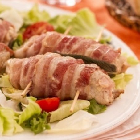 Adagiare su un piano di lavoro 2 fettine di pancetta e arrotolarle all'esterno dell'involtino: ora procedere in questo modo per le altre 7 fettine di lonza e comporre gli spiedini infilzando l'involtino con due spiedini di legno, intervallare con due foglie di salvia e infilzare un altro involtino con altre due foglie di salvia.