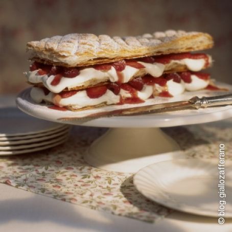Spolvera la pasta con dello zucchero a velo e passala qualche secondo al grill. Monta la millefoglie alterna un foglio di pasta, la crema pasticciera e le fragoline, continua fino a costruire 3 piani. Decora con qualche fragola e qualche foglia di menta.
