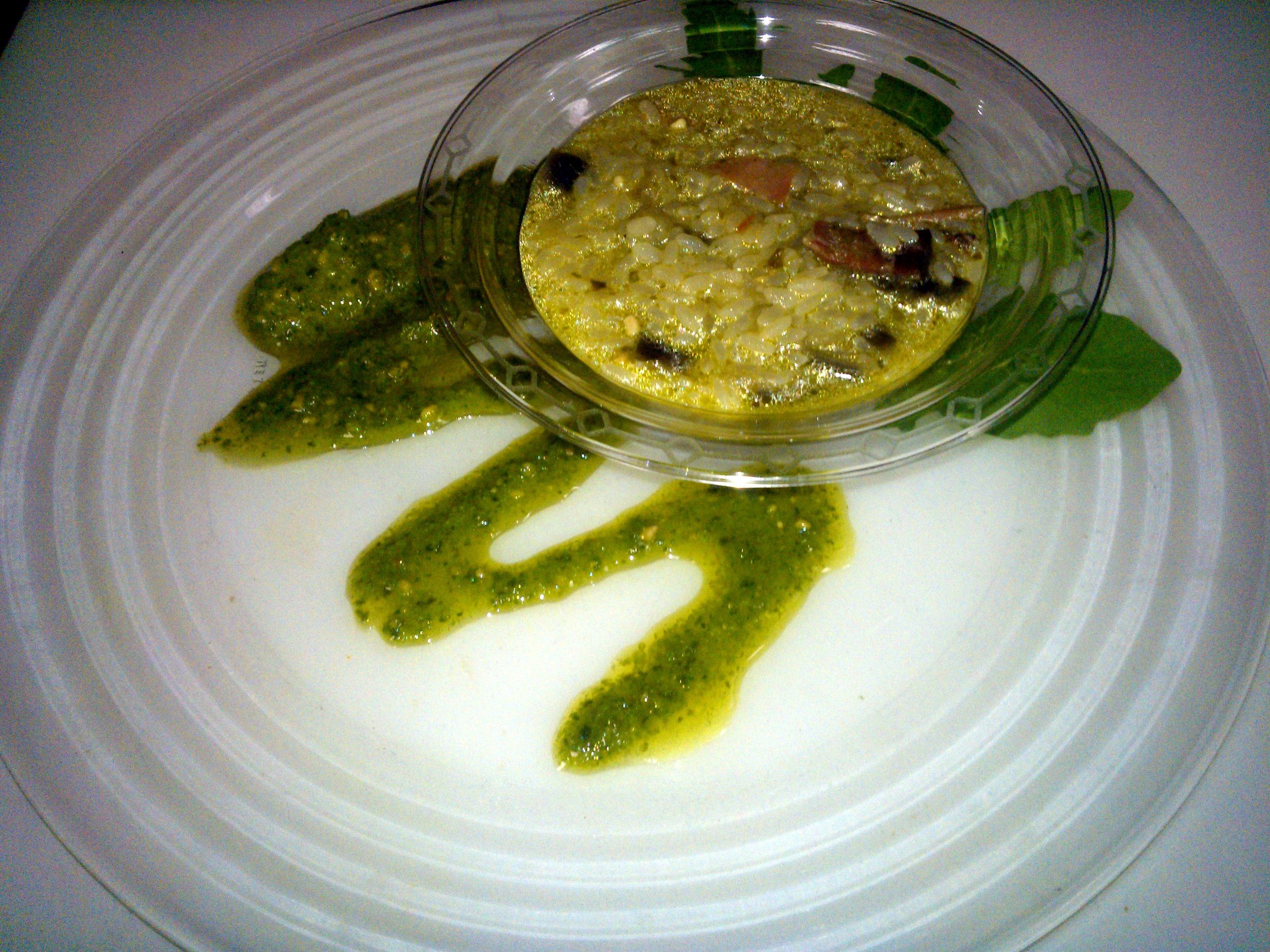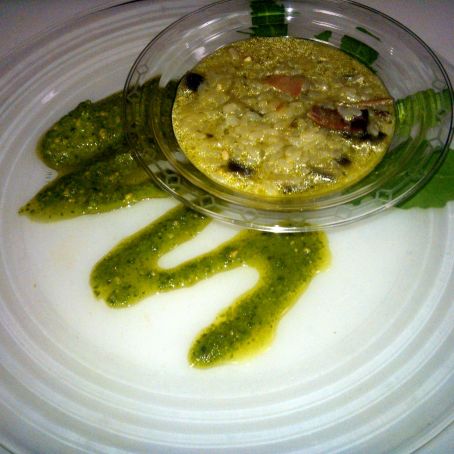 Versare il consommé (mestolo a mestolo) nel riso ed aggiungere la vellutata verde lasciandone un po' per guarnire il piatto. Lasciar cucinare il riso per dieci minuti ca.