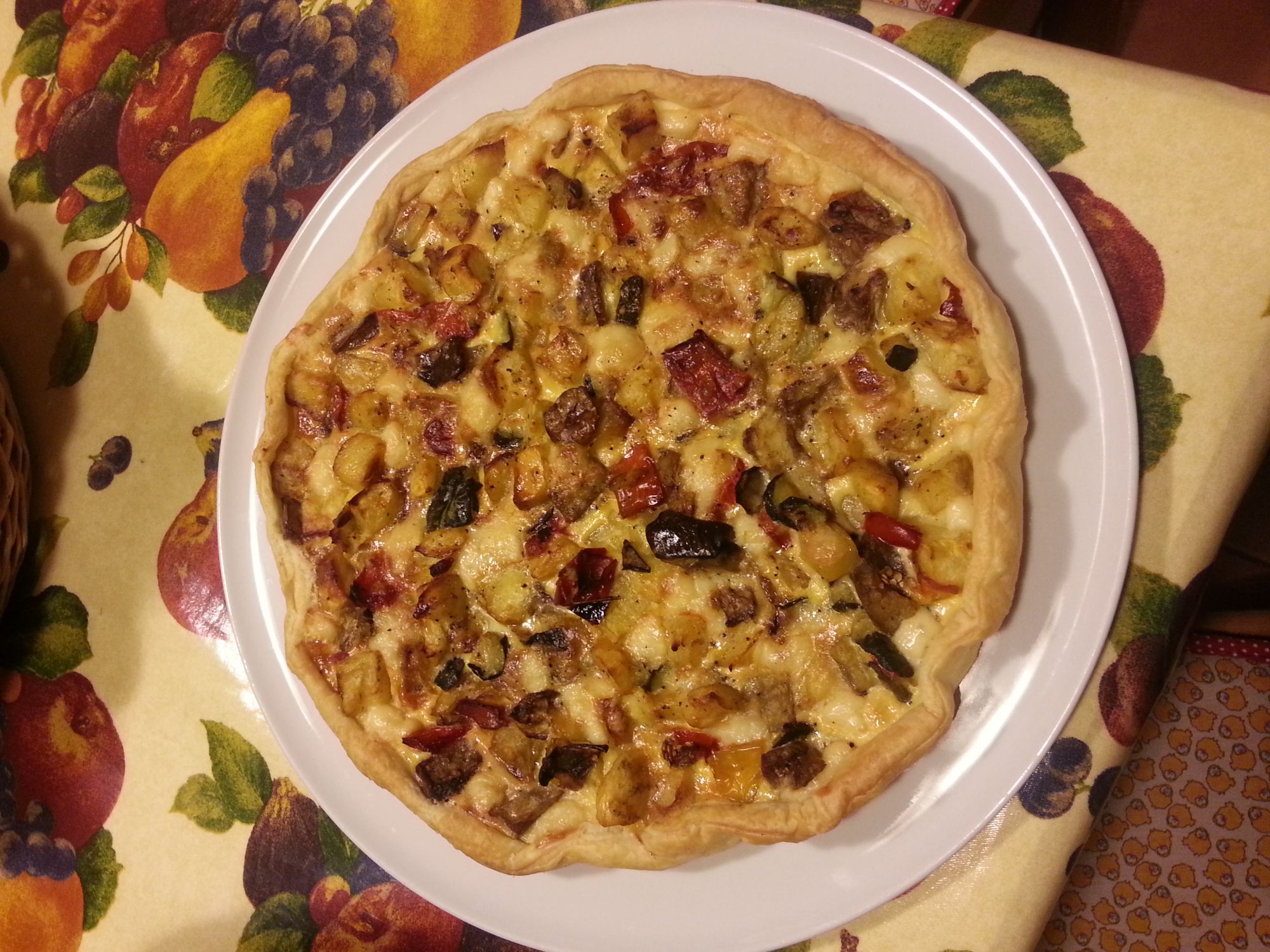 Distendere il rotolo di pasta brisè su una teglia e bucherellare la pasta. Distribuire il soffritto di verdure nella teglia. Sbattere 3 uova con il parmiggiano, il sale e il pepe e mettere il composto nella teglia distribuendolo tra le verdure. Inserire qualche cubetto di provola tra le verdure.