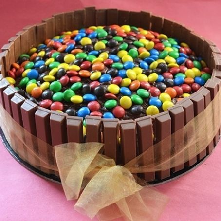 Poggiate i kit kat a palizzata tutto intorno alla torta facendoli aderire alla superficie di quest’ultima. Decorate la torta kit kat con un fiocco e cospargete la superficie con gli m&m’s quindi mettete in frigo per un’ora prima di servirla.