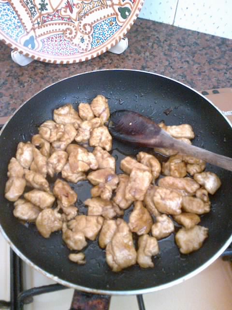 Durante la cottura unire una tazzina di acqua e 4 o 5 cucchiai di salsa di soia.