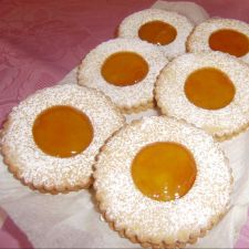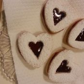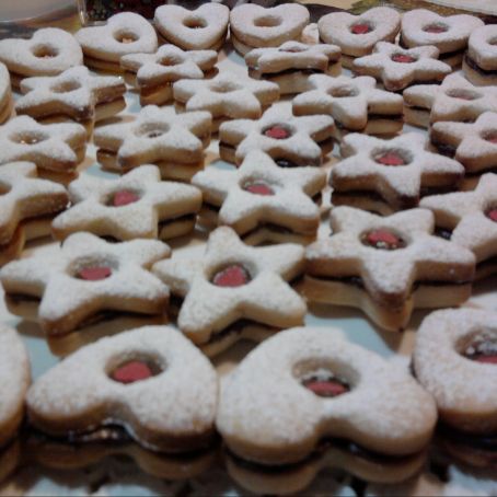Cotti i biscotti, corspargere quello bucato, che andrà sopra, di zucchero a velo. Spalmare la crema alle nocciole/marmellata sulla parte piatta di quello interno e, con delicatezza, completare il biscotto sovrapponendo quello bucato e zuccherato.