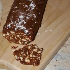 Frullare con il mixer i tuorli, lo zucchero, il burro sciolto e il cacao amaro. Aggiugere i biscotti spezzettati e frullare leggermente. Rovesciare l'impasto sulla carta stagnola e dargli la forma del salame. Lasciar riposare in frigo per una notte.